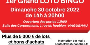 Information générale Loto bingo le 30 octobre Pour réserver vos places, écrivez à contact@ash-handball.fr en indiquant Nom, Prénom et N° tel portable